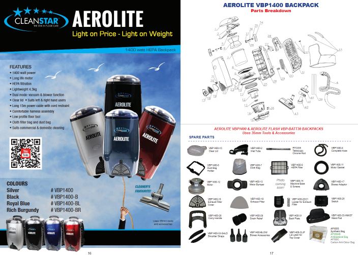 - Cleanstar - AeroLite Backpack, VBP1400, VBP1400-B, VBP1400-P, VBP1400-R, VBP1400-PK, AeroLite Eco, VBP-Eco.