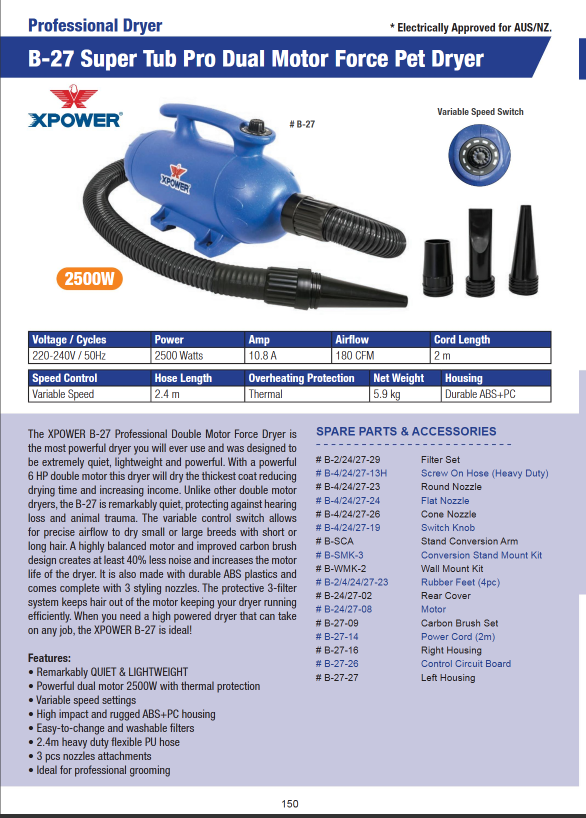 The Right Housing for B-27 is a genuine, precision-molded replacement external shell designed to fit the XPOWER B-27 Dual Motor Pet Dryer. Built from rugged ABS / PC plastics (matching the original build specification) this housing replaces damaged or cracked casing to restore structural stability, proper airflow routing, and safe containment of internal components. By replacing worn or broken housing, you protect the dryer’s internal motor, wiring, and airflow system - ensuring long-term reliability and user safety. Whether you’re performing maintenance on a salon-used dryer or refurbishing an older unit, this right housing is essential for restoring the unit to “as new” condition, avoiding dust/motor damage, and maintaining the dryer’s durability under heavy-duty use. Ideal for pet grooming professionals or anyone committed to keeping their B-27 dryer performing at peak levels.