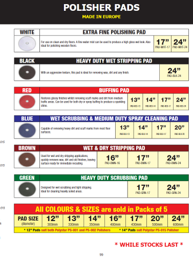 Designed for wet scrubbing and light stripping. Ideal for cleaning heavily soiled areas. Regular speed pad.