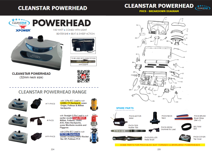 - Cleanstar Powerhead with 2 pin IEC fittings (see picture) to suit various Pacvac, Pullman and Hako backpack vacuum cleaners