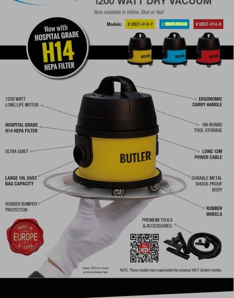 The stylish blue canister design is compact yet powerful, perfect for both residential and light commercial use. The Butler Canister Vacuum offers quiet performance, a high-capacity dust bag, and advanced filtration, making it one of the most hygienic vacuums on the market.