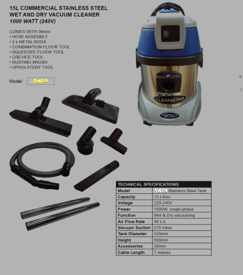 Upgrade your cleaning routine with the CLEANSTAR Commercial Vacuum Cleaner 15L. Built with a durable stainless steel body, this powerful wet and dry vacuum is perfect for industrial and commercial use. With a 15-litre tank capacity, it tackles dust, dirt, debris, and liquid spills with ease. Ideal for warehouses, workshops, offices, and janitorial teams, the Cleanstar vacuum delivers high suction performance and long-lasting reliability.